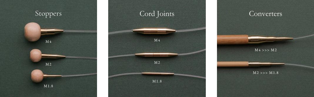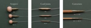 - Spojky lanek (Cord Joints) – slouží k propojení dvou lanek dohromady a vytvoření delšího. Pomocí nich můžete i uzavřít lanko bez jehlic, když chcete projekt bezpečně uložit.