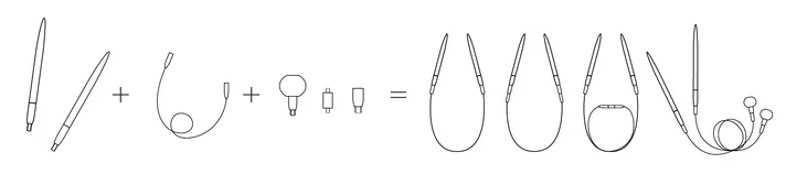 - Zarážky (Stoppers) – našroubují se místo jehlice, aby oka nesklouzla z lanka. Můžete tak nechat rozdělaný projekt odložený, nebo používat lanko jako flexibilní rovnou jehlici.