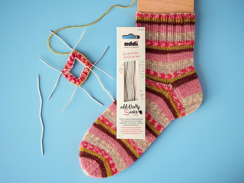 Ponožkové jehlice addiCraSySnake spojují pohodlí, jistotu a preciznost v jednom. Díky inovativnímu vlnitému tvaru zůstávají oka bezpečně na jehlici – i při volnějším pletení nebo práci složitých vzorů. Ergonomický design zajišťuje, že jehlice skvěle padnou do ruky a umožňují pohodlné pletení i při delších projektech.