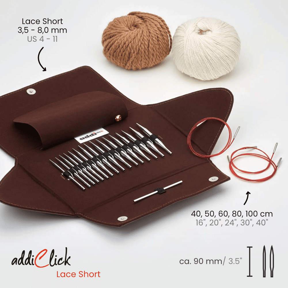 addiClick Lace Short je sada vyměnitelných kruhových jehlic s krátkými a ostrými špičkami v lehkém textilním pouzdru. Díky patentovanému systému addiClick jednoduše spojíš jehlice a lanka otočením – uslyšíš pevný “click”, a můžeš hned začít plést.
